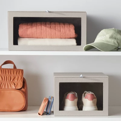 Bring organization to your space with the help of this Hardside Fabric Front Open Bin from Brightroom™. Featuring a cubical silhouette, this hardside storage bin with a fabric covering offers you additional storage space for everyday household items. Showcasing a transparent front to let you know the contents without having to open it, it features a front-open design with a fabric pull on top for easy accessing the contents. Use it to store a variety of everyday household items to keep your space clutter-free.